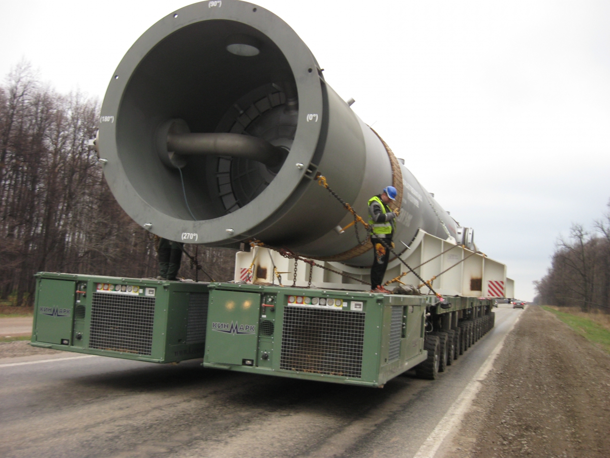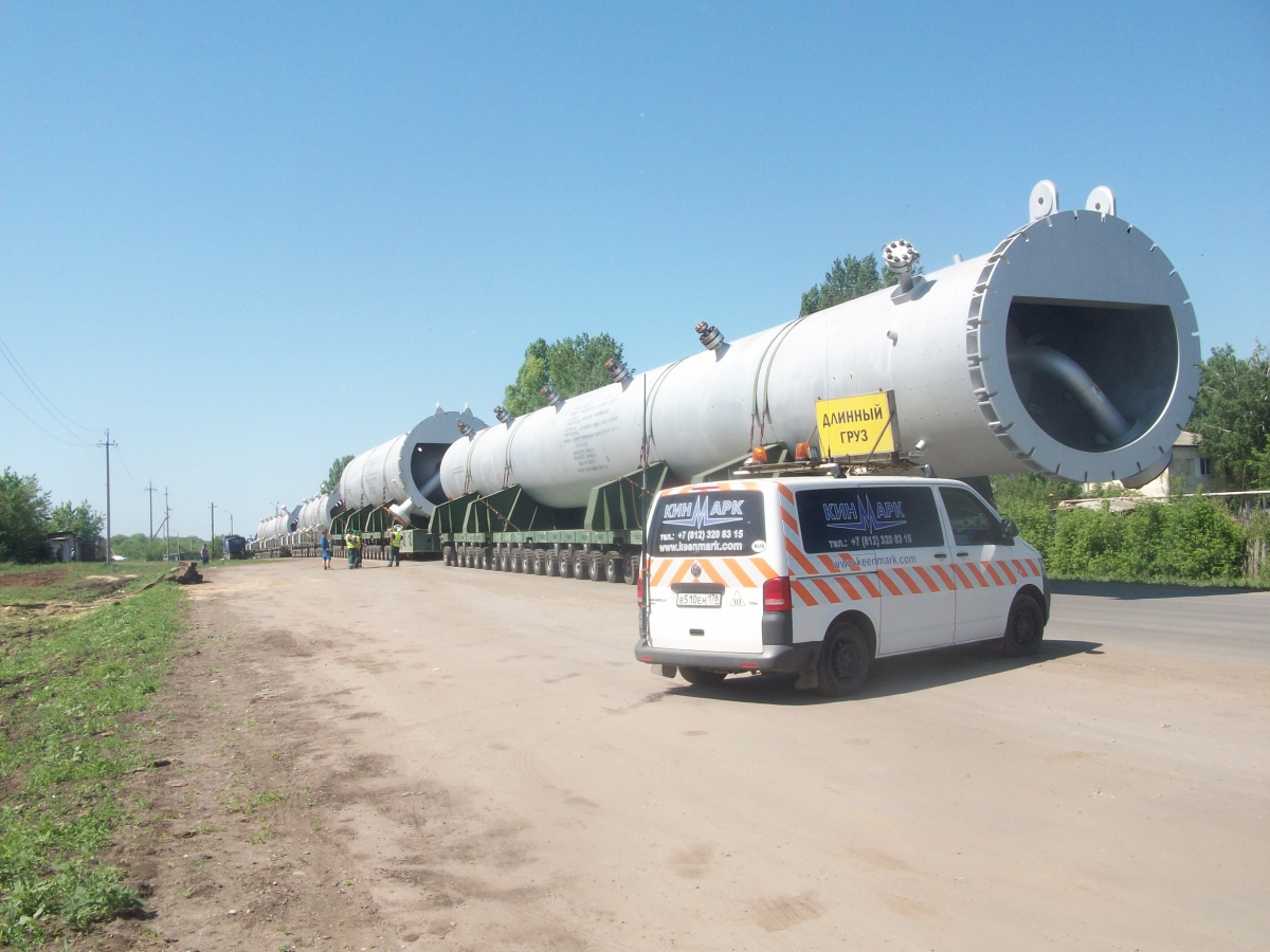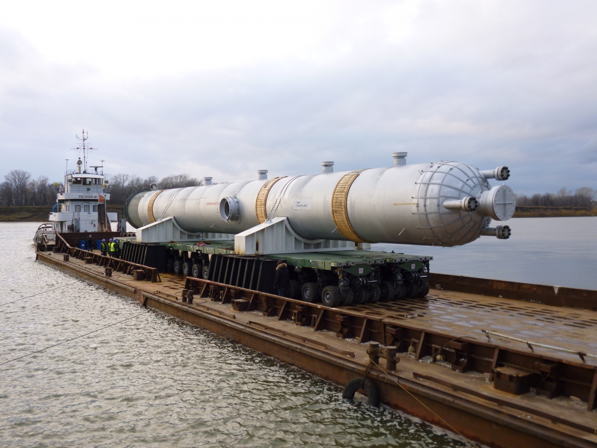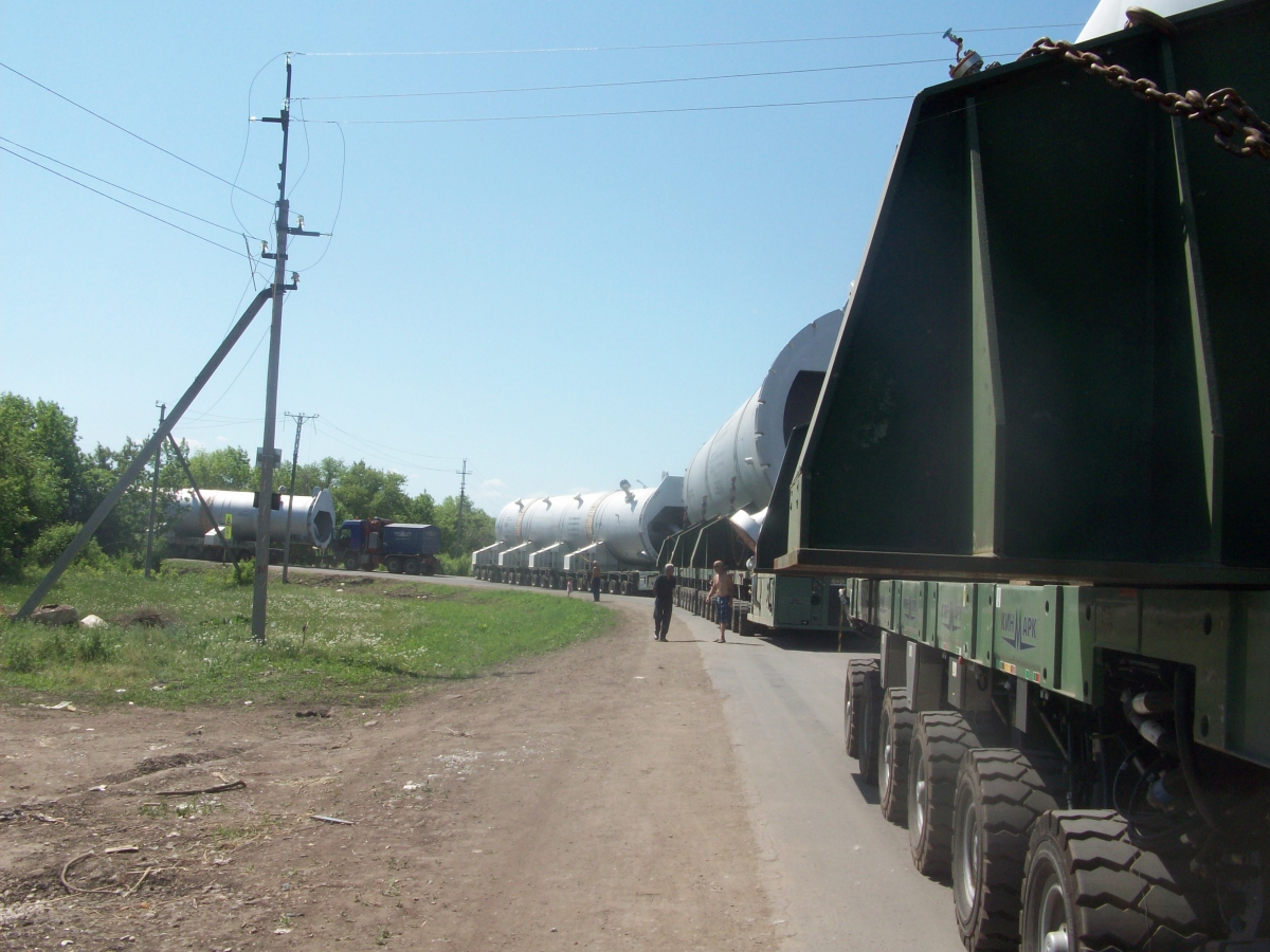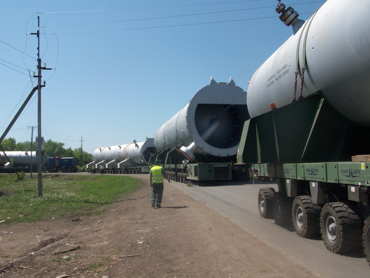 Multimodal transportation of equipment with more than 100 units, total weight 2500 tons, moving via route S.Petersburg – Salavat. Sea, river and road transport was engaged during the transportation. Temporary customs control zone was opened. Maximum dimensions: diameter – 8,8 m, height – 4,7m, total weight – 275 tons. The realization of this project required bridge structure strengthening, lifting of the high voltage transmission lines, development of the RO-RO quay.